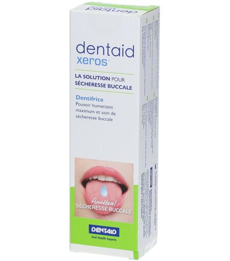 La sécheresse buccale peut avoir diverses conséquences en termes de santé buccodentaire : difficultés pour parler et manger, langue et lèvres sèches, gingivites, caries, mauvaise haleine, altération des tissus mous. Ces divers symptômes peuvent considérablement affecter la qualité de vie. Le Dentifrice Dentaid Xeros se combine idéalement avec les autres produits Dentaid Xeros et contribue à la santé buccodentaire.Saveur douce Tampon intégré Contient des sels minérauxAction Hydrate la bouche Stimule la production de salive Renforce l’émail Prévient la mauvaise haleineBénéficesAtténue immédiatement les symptômes de la sécheresse buccale, hydrate directement la boucheStimule la production salivaireRéduit les irritationsProtège contre les caries et reminéralise l’émail dentaireEmpêche la mauvaise haleineDélicieux goût de pomme/mentheIndicationsLe Dentifrice Dentaid Xeros peut être utilisé quotidiennement par les personnes souffrant de sécheresse buccale, afin d’en atténuer les symptômes et de contribuer à la santé buccodentaire.Conseils d'utilisationPlacez une noisette de dentifrice sur la brosse à dents. Brossez-vous les dents conformément aux instructions de votre dentiste, hygiéniste dentaire ou assistant en prévention. Il est généralement recommandé de se brosser les dents trois fois par jour, après les repas. Après le brossage, se rincer la bouche à l’eau.Principaux actifsBétaïne 4,00 % Humidification de la cavité buccaleXylitol 10,00 % Reminéralisation de l’émail et action antibactérienneAllantoïne 0,10 % Atténuation des irritations et régénérescence des tissus mousFluorure de sodium 1450 ppm Protection de l’émailCompositionEau, sorbitol, silice, glycérine, xylitol, bétaïne, cocamidopropylbétaïne, dioxyde de titane, gomme de xanthane, fluorure de sodium, chlorure de sodium (chlorure sodique), chlorure de potassium (chlorure potassique), allantoïne, acide lactique, huile de ricin hydrogénée PEG-40, phosphate de sodium, parabène méthylique de sodium (parahydroxybenzoate de méthyle sodique), saccharinate de sodium, arôme.ConditionnementTube de 75 ml ...
