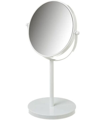 Miroir grossissant x5 sur pied en métal blanc . Ce miroir mural est à double face avec une face grossissante x5 et une face normale. Dimensions : 17x17x35cm Couleur : Blanc Matière : Métal et Verre ...