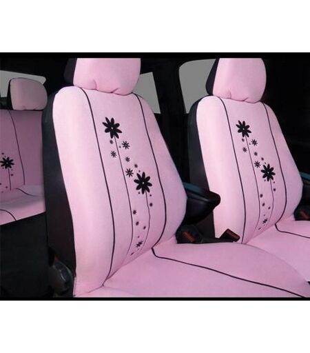 Jeu complet de housses universelles URBAN GIRL pour sièges avant et arrière. - Assumez votre côté girly avec ces fleurs stylées raffinées noires sur fond rose. 10 pièces - 4 appuie-têtes : 32x28cm - - 2 sièges avant (dossiers) : 63x55cm - - 2 sièges avant (assises) : ... ...