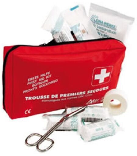 Trousse de premiers secours Contient : - 1 paire de ciseaux - 1 guide de premier secours - 4 gants à usage unique - 6 compresses stériles 10x10cm - 1 rouleau de sparadraps 5mx2.5cm - 2 écharpes triangulaires - 8 pansements adhésifs 6x10cm - 2 bandes élastiques 6cmx4m - 3 bandes élastiques 8cmx4m - 1 compresse stérile spéciale brûlure 60x80cm - 2 compresses stériles spéciale brûlure 40x60cm - 3 pansements compressifs stériles 8x10cm - 1 pansement compressif stérile 10x12cm - 1 couverture de survie 10x160cm ...