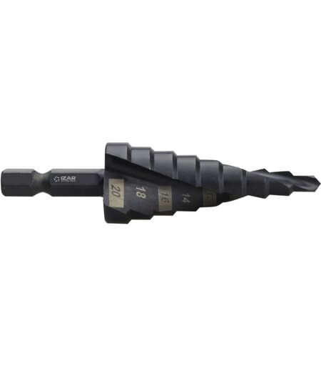 Forêt HSS étagé Spiral 1/4 DIN E6.3 (040 x 20,0) - IZAR - Art.59003Capacité : 4-20 (4-6-8-10-12-14-16-18-20 mm).- Pointe plus robuste autocentrante- Ébavurage special à 45o- Réduction de l ́usure et de l ́éffort de coupe- Augmentation de la performance et vie utile de l'outil- Meilleure évacuation des copeaux - Finition sans bavures ...