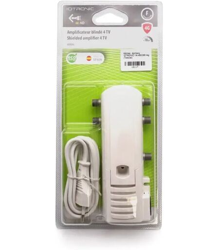 Amplificateur domestique orientable IOTRONIC 1/4 Televes réf. 4800086 Amplificateur domestique 4 sorties pour étendre votre réseau TV terrestre domestique. Equipé d'un filtre LTE790/4G. Caractéristiques distinctives Design esthétique, dimensions réduites Alimentation à découpage intégrée à haut rendement : consommation de courant réduite Production entièrement automatisée soumise à un contrôle qualité rigoureux Caractéristiques générales Réglage manuel du gain dans la plage de 3 à 18 dB Vissé au mur Connecteurs « F » ...