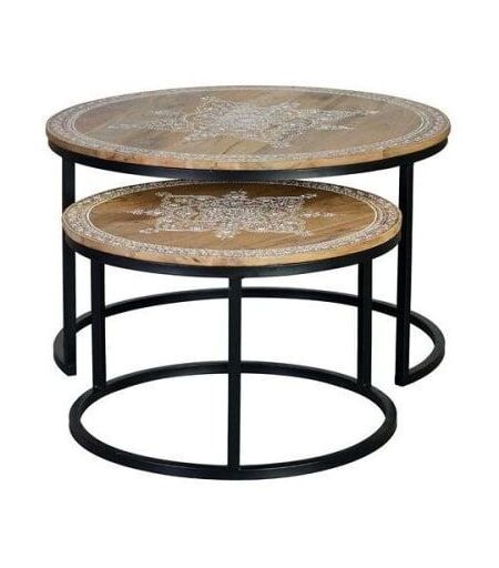 Set de 2 tables en bois de manguier et piètement en fer. Détails peints à la main sur le couvercle. Dimensions de la grande table : 48 cm de haut x 80 cm de diamètre. Petite taille : 40 cm de haut x 60 cm de diamètre. Étant donné qu'il s'agit d'un meuble en bois naturel et fabriqué à la main, il peut conserver ses n?uds et ses veines d'origine et peut donc présenter des différences en ce qui concerne la couleur. ...