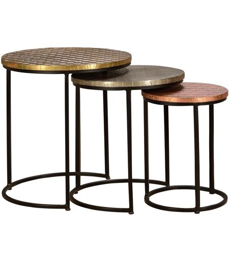 Ensemble de 3 tables gigognes en métal aux finitions bronze, cuivre et laiton. Grandes mesures : 52 cm de haut X 48 cm de diamètre. Volume 00,12 m3. Étant donné qu'il s'agit d'un meuble en bois naturel et fabriqué à la main, il peut conserver ses n?uds et ses veines d'origine et peut donc présenter des différences en ce qui concerne la couleur. ...