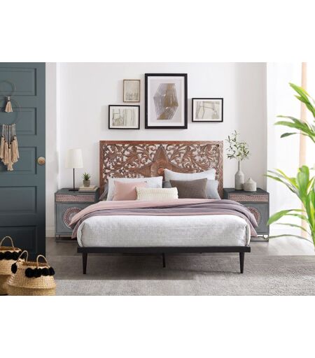 Table de chevet 1 porte et 1 tiroir en bois de manguier et piètement en métal, avec détails sculptés à la main. - dimension façade tiroir : 9 x 46 cm - dimension intérieur tiroir : 7 x 41 x 33 cm - dimension porte : 35 x 34 cm - hauteur étagère intérieure : 18 cm - hauteur pieds : 10 cm ...
