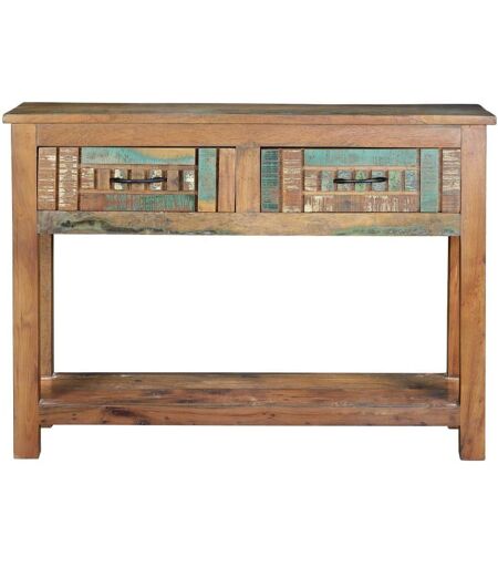 Console à 2 tiroirs en bois recyclé provenant de navires, de vieilles portes et de meubles de récupération. Multicolore. Mesure 76 cm de haut X 106 cm de large X 33 cm de profondeur. Poids 33 kg. L'emballage mesure 113 x 40 x 85 cm. Il est servi monté. Contenu de chaque boîte : 1 unité. Étant donné qu'il s'agit d'un meuble en bois naturel et fabriqué à la main, il peut conserver ses n?uds et ses veines d'origine et peut donc présenter des différences en ce qui concerne la couleur. ...