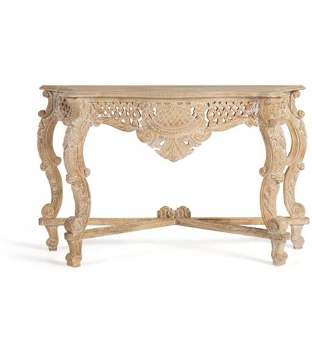 Console sculptée à la main en bois de manguier au coloris blanc vieilli. Dimensions de l'article : 76x120x42 cm. Poids : 22 kg. Dimensions de l'emballage : 80 x124x46 cm. Étant donné qu'il s'agit d'un meuble en bois naturel et fabriqué à la main, il peut conserver ses nœuds et ses veines d'origine et peut donc présenter des différences en ce qui concerne la couleur. ...