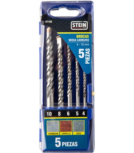 Foret de haute qualité. Pour percer le béton et la brique en grès. Foret hélicoïdal STEIN en carbure de widia de haute dureté. Indiqué pour la brique, la pierre, le béton. Arêtes de coupe arrondies et pointe aiguisée à 135º. li>Jeu de 5 pièces avec forets de 4,5,6,8 et 10 mm. ...