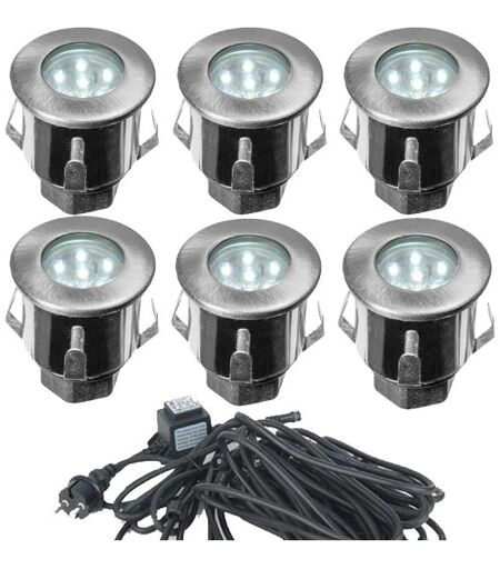 Kit 6 Mini Spots LED- 6x 0.3W - Encastrables - 12V - transformateur 12V Inclus - IP67 - Blanc chaud ou Banc froid au choix - Transformateur inclus. Tension d'utilisation : 220-240 Volts AC (transformateur 12v inclus) Consommation : 6x 0,3 Watts Classe énergétique (avant 09/2021) : A+ Durée de vie des LED (en heures) : 30000 Angle d'éclairage / faisceau (en °) : 90 Blanc Chaud (2900 K) : 6x 20 lumens Blanc Froid (6000 K) : 6x 20 lumens IRC (Indice de Rendu des Couleurs) : Supérieur à 80 Compatible variateur (dimmable) : Non Finition / Couleur : Brossé Matériaux : Inox IP (Indice de Protection) : IP67 Diamètre : 35 mm Diamètre de perçage : 30 mm Fixation : Encastrable Profondeur : 39 mm Longueur du câble / du chargeur : 2 mètres Certification(s) : CE & RoHS Garantie constructeur (en année(s)) : 2 Batterie(s) ou pile(s) incluse(s) : non Contient du bois : non ...