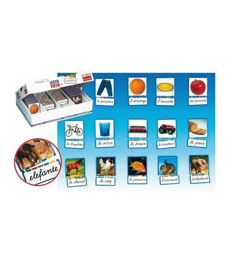 Lecto Foto des images et des mots 1 coffret composé de 216 fiches en carton épais ( 2,5 mm ) : - 108 fiches 7 x 7 cm avec des photos, - 108 étiquettes-mots 7 x 3 cm ( lettre cursive ) Ce jeu est fondé sur la reconnaissance d'une image et son association avec un mot. Un système de bandes de couleur permet à l'enfant de s'auto corriger. Un jeu intelligent pour enrichir son vocabulaire et aborder ainsi la lecture. ...