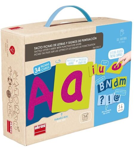 Jeu sensoriel des lettres et des ponctuations ! Ce jeu est destiné à initier votre enfant à l'apprentissage des lettres, de l'alphabétisation et à la pré-écriture par le sens du toucher. La surface rugueuse favorise le mouvement de la main nécessaire pour l'écriture de chaque lettre. La boîte contient 35 cartes en carton épais et résistant de 9 cm x 9 cm. Chaque carte représente des lettres de l'alphabet ou des signes de ponctuation. Elles sont imprimées sur les deux faces avec sur une face la lettre en minuscule et sur l'autre face la lettre en capitale. Ce que votre enfant peut développer avec ce jeu sensoriel des lettres et des ponctuations : * Développement du sens du toucher. * Développement de la coordination oeil-main. * Développement des connaissances de l'aphabet, la différenciation entre les minuscules et majuscules, entre les voyelles et les consonnes. * Développement de la capacité d'observation et d'attention. Dimensions : Dimension de la boîte 24.5 cm x 19 cm x 7 cm. Dimension des cartes 9 cm x 9 cm. Âge : De 3 ans à 6 ans. Précaution d'emplois : Ne pas laver. Retirer les éléments d'emballage avant de laisser le jeu à l'enfant. Fabricant : Akros - Fabriqué en Espagne. ...