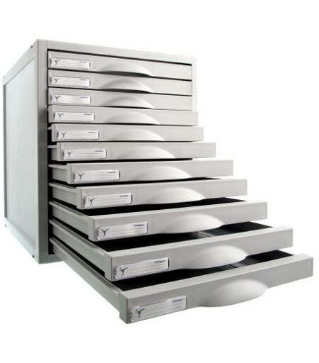 Module de 11 tiroirs. 12 tiroirs avec glissière souple et arrêt de sécurité. 11 tiroirs de 22 mm. Dimensions intérieures des tiroirs de 22 mm : 322 x 265 x 22 mm (profondeur x largeur x hauteur). Comprend un porte-cartes d'identification dans tous les tiroirs. ...