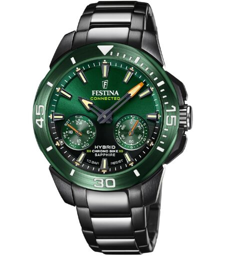 3Suisses : La montre Festina F20646/1 pour homme est une véritable ?uvre d'art en acier inoxydable 316L et en verre saphir. De plus, la marque Festina est mondialement reconnue pour sa capacité à combiner élégance et fonctionnalité dans chacun de ses designs. Son innovation technologique constante et son excellent rapport qualité-prix en font un choix idéal pour ceux qui recherchent une montre de haute qualité et de sophistication. Avec la Festina F20646/1, vous pourrez porter un accessoire de luxe qui non seulement vous donnera l'heure exacte, mais vous fera également vous démarquer en toute occasion. N'attendez plus pour l'acquérir et profiter de l'excellence de Festina !Les montres Festina sont connues pour leur mélange parfait d'élégance et de fonctionnalité, et ce modèle ne fait pas exception. Avec des designs distingués, une innovation technologique constante et un excellent rapport qualité-prix, Festina est le choix parfait pour ceux qui recherchent le meilleur en matière de montres haut de gammeConnectivité intelligente et fonctions polyvalentes dans une seule montreVous pouvez filtrer les messages, les appels et les notifications de vos réseaux sociaux préférés. L'utilisation de ce nouvel accessoire technologique est vraiment immédiate : en appuyant simplement sur la couronne, les aiguilles affichent la date et l'heure dans un second fuseau horaire.De plus, avec les boutons, vous pouvez contrôler la musique de votre smartphone, prendre des photos, enregistrer une position géographique et localiser votre téléphone, ainsi qu'allumer les lumières de la pièce ou ouvrir la porte de la maison, et bien plus encore. Il existe quatre propositions raffinées qui associent de l'acier avec un traitement IP noir ou bleu, avec des détails en or jaune ou rose.La lunette rotative et les index luminescents font de ces montres des compagnons parfaits pour un usage quotidien. Le bracelet en caoutchouc supplémentaire avec un motif camouflage est un détail élégant qui rend cette collection encore plus désirable, car il s'adapte à chaque changement de tenue.CARACTÉRISTIQUESBOÎTEBOÎTIERAcier InoxydableÉPAISSEUR14.51 mmFORMERondeDIAMÈTRE DU BOÎTIER45.5 mmNOMBRE DE BOUTONS POUSSOIRS2CADRAN DE LA MONTRECOULEURNoirVERRESaphirNOMBRE D'AIGUILLES4BRACELETMATIÈREAcier InoxydableCOULEURNoirLARGEUR22.0 mmTYPE DE FERMOIRDouble Bouton PoussoirMOUVEMENTTAPEZHybridePRÉNOMMbt003.5-l Smart WatchTYPE DE BATTERIECr3032FONCTIONSFONCTION PRINCIPALEFonctions IntelligentesCALENDRIERNonCARACTÉRISTIQUESETANCHÉITÉ À L'EAU10 ATM Caractéristiques : Boîtier / Cadran : rond Boitier et bracelet en acier noir Lunette et cadran vert Affichage analogique Fonctionnalités : Connectez-vous Notifications filtrées: Ne manquez jamais ce qui est important Télécommande de l'appareil photo: La photo parfaite Contrôle de la musique: Instant tunes If This Then That: Programmer des actions en fonction de vos besoins quotidiens Sport Bougez: Levez-vous Daily Hundred: Chaque pas compte Objectif... ...