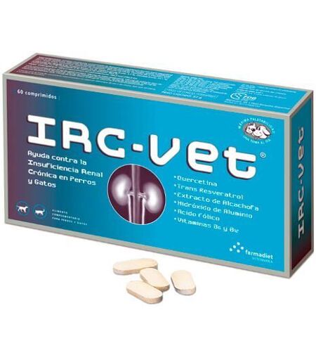 IRC-Vet, complément pour l'insuffisance rénale chronique chez les chiens et les chats. Supplément nutritionnel thérapeutique spécialement indiqué comme complément au traitement de l'insuffisance rénale chronique chez les chiens et les chats. IRC-Vet permet de ralentir le développement de cette pathologie. Fabriqué par les laboratoires Farmadiet Veterinaria.Sa formule complète à base de Quercetine, Trans-resvératrol, d'un extrait de Polygonum cuspidatum, d'Acide folique, de Vitamines B6 et B12, d'Hydroxyde d'aluminium et d'Extrait sec d'artichaut avec 2,5% de Cinarine, agit en tant que citoprotecteur rénale, anti-inflammatoire et chélateur du phosphore, ce qui permet aux reins endommagés de réaliser leurs fonctions normalement. IRC-Vet agit comme chélateurs du phosphore, c'est-à-dire, qu'il se combine avec le phosphore des aliments dans l'intestin, et diminue l'absorption intestinale, ce qui réduit la présence de celui-ci dans le sang, tout en soulageant les reins endommagés. Ce phospho... ...