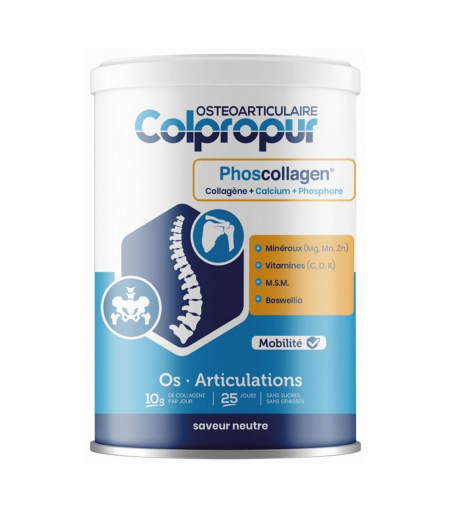 Le PhosCollagen Neutre 10g 25 jours de la catégorie Articulations / Os est un produit de COLPROPUR spécifiquement conçu pour le soin du système musculo-squelettique, mettant l'accent sur les os et les articulations. Sa forme de poudre soluble intègre les bienfaits du MSM et de la Boswellia serrata, agissant comme des analgésiques et des anti-inflammatoires pour soulager les articulations et améliorer la mobilité. De plus, le Phoscollagen contribue à améliorer la minéralisation osseuse grâce à ses composants de calcium, de phosphore et de 10g de collagène. Les vitamines et minéraux contenus dans ce produit favorisent le maintien d'une ossature et d'une musculature normales, réduisent la fatigue et améliorent l'assimilation et la formation du collagène. Ce produit s'adresse aux hommes et femmes de 40 ans et plus, offrant des bienfaits ressentis dès 1 à 3 mois après le début de la prise. Il est obtenu naturellement, sans utilisation de substances chimiques, graisses, sucres, édulcorants artificiels, colorants, conservateurs, allergènes, OGM ni résidus chimiques. De plus, il est compatible avec la prise de compléments et de médicaments, ne nécessitant pas de période de pause dans le traitement.La formule neutre du Osteoarticulaire PhosCollagen Neutre 10g 25 jours est composée de Phoscollagen® (Collagène hydrolysé Colpropur D® bovine avec phosphate tricalcique osseux), Citrate de magnésium, MSM (Méthylsulfonylméthane), Extrait de boswellia, Vitamine C, Gluconate de zinc, Stévia, Gomme xanthane, Citrate de manganèse, Vitamine D3, Vitamine K, Arôme. Pour 100g, il fournit 1323 kJ/308 kcal d'énergie, 77g de protéines, 4615 mg de calcium, 2154 mg de phosphore, 1154 mg de magnésium, 31 mg de zinc, 6 mg de manganèse, 246 mg de vitamine C, 231 µg de vitamine K, 77 µg de vitamine D3, 769 mg de MSM et 385 mg d'extrait de boswellia.En somme, le Osteoarticulaire PhosCollagen Neutre 10g 25 jours offre une approche holistique pour le soin des os et des articulations, fournissant une solution naturelle, efficace et compatible avec d'autres compléments ou médicaments sans nécessiter de pause dans le traitement. ...