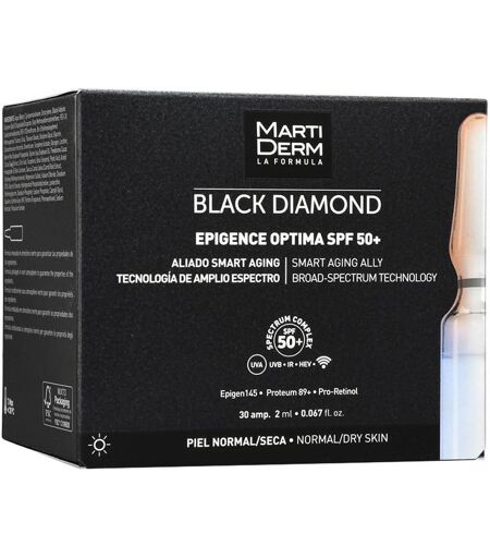 Ampoules BLACK DIAMOND EPIGENCE OPTIMA pour peaux normales-sèches SPF50+. Anti-rides et anti-âge - Soin du visage raffermissant - Anti-taches. Âge: Entre 36 et 50 ans, Plus de 50 ans. Type de peau: Sèche, Normale, Tous types de peaux. Traitement: Jour. Format: Unidose. Produit de parapharmacie. Protection SPF: SPF 50 + très élevé ...