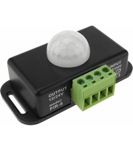 Détecteur de mouvement infrarouge. Petit appareil à installer dans des endroits avec un espace réduit (intérieur des armoires, sous les meubles, etc.). Pour l'installation, tenez-le simplement grâce aux deux ailettes disponibles pour passer une vis. Il agit comme un interrupteur, de sorte que lorsqu'il détecte un mouvement, il ferme le circuit (active l'interrupteur). Les applications peuvent être nombreuses (activation de l'éclairage, sécurité, sonneries, etc.). Spécifications Détecteur de mouvement infrarouge, de très petite taille, noir. Petit appareil pouvant être installé dans des endroits avec un espace réduit. Alimentation 12-24 VDC. À l'heure (à l'heure) de 1 à 10 minutes (configurable). Angle de détection de 60 °. Distance de détection de 8 m maximum. Connexion via bornier. 2 entrées et 2 sorties. Taille du capteur (largeur x hauteur x profondeur): 76 x 45 x 33 mm. ...