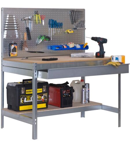 Etabli atelier Bois Métal avec panneau porte outils et tiroir de rangement 1440x900x600mm galva 2 niveaux agglo 400kg en kit (BT-2 BOX 900) ...