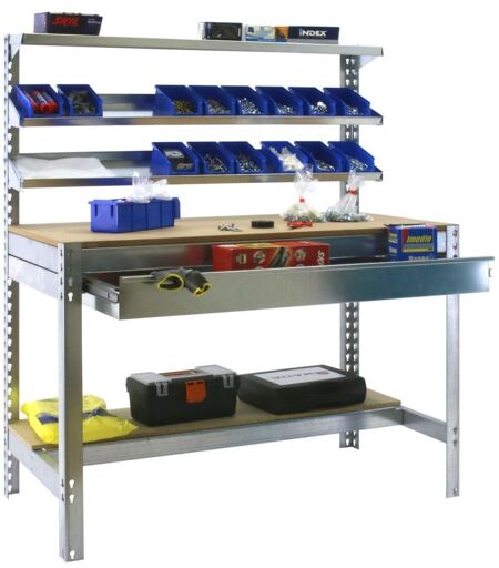 Simon Rack Etabli atelier Bois Métal avec tiroir de rangement 1440x1200x750mm galva 4 niveaux agglo 600kg en kit (BT-1 BOX 1200)