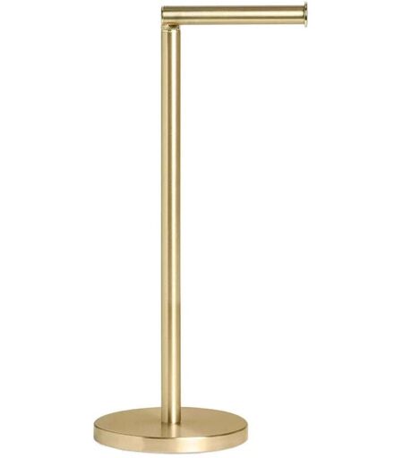 Este portarrollos para el cuarto de baño es de metal de color dorado mate. Se trata de un pieza de estilo clásico que combina en baños minimalistas y elegantes. Tiene un soporte plegable para poder pasar fácilmente los rollos por la estructura y apilarlos. Se puede combinar con otros accesorios para el cuarto de baño de la misma colección. ...