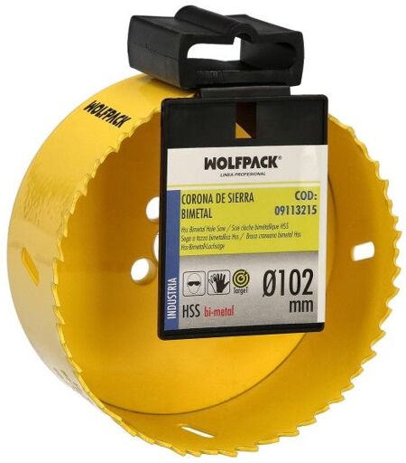 Corona De Sierra Bimetal Target - Medida: Ø 102 mm. - Realizado en una aleacion de alta dureza y resistencia al desgaste. - Dientes templados termicamente, por lo que le confiere una alta estabilidad a las aristas de corte. - Base de la corona reforzada. - Orificios laterales para la evacuación de virutas y una mejor refrigeración. - Ideal para hacer orifiios en madera, plastico, PVC. - Articulo conocido como broca madera, broca agujeros madera, sierra madera, sierra agujeros madera. ...