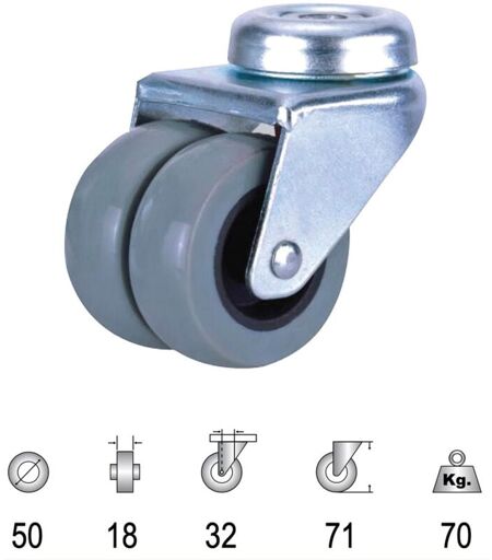 Rueda doméstica Doble Poliamida Gris Pasante 50mm - Ø: 50 mm. - Ancho: 18 mm. - Capacidad: 70 Kgs. - Ø para espiga: 32 mm. - Altura de la rueda: 71 mm. ...