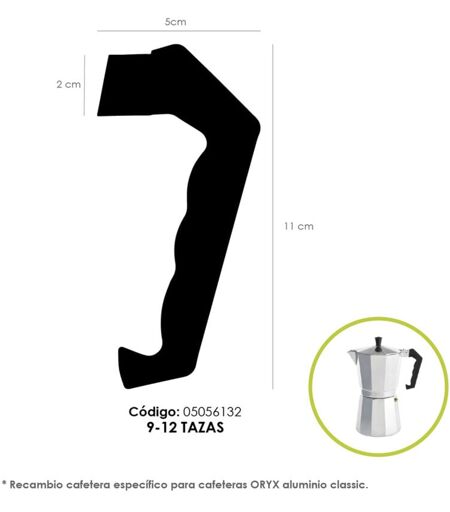 Mango Cafeteras Alumino Clásica 9 y 12 Tazas - 1 unidad. - Mango universal para casi todas las caferas de aluminio de 9 y 12 tazas. - Recambio cafetera específico para cafeteras ORYX aluminio classic. - Valido para: > 05056013: Cafetera aluminio classic 9 tazas. > 05056014: Cafetera aluminio classic 12 tazas. ...