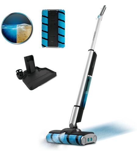 Balai-serpillière électrique FreeGo Wash Twice Spray. 40 minutes d?autonomie. Deux brosses rotatives. Réservoir pour l?eau propre de 450 ml et réservoir pour l?eau sale de 350 ml. Pulvérisateur d`eau et base d?auto-nettoyage. Pulvérisateur d?eau. Balai électrique : la révolution du nettoyage du sol est arrivée. Oubliez le nettoyage traditionnel et profitez d`un nettoyage en profondeur sans effort. Double Wet Jalisco qui élimine la saleté et sèche le sol. Profitez d`un nettoyage en profondeur pour les sols les plus exigeants. 40 minutes d?autonomie : nettoyez toute la maison sans avoir à le recharger. Pulvérisateur avant : humidifie le sol pour éliminer la saleté sans effort et en un seul passage. Convient pour tous types de saletés : éliminez tous types de saletés, qu?elles soient solides ou humides. Base d?auto-nettoyage : base qui sert à nettoyer les brosses en toute simplicité. Avec pulvérisateur avant. Il est donc idéal pour tous types de sols, y compris les sols délicats comme le parquet ou le sol stratifié. Réservoir d?eau propre et réservoir d?eau sale : nettoyez toute la maison sans avoir à vider le réservoir. Balai-serpillière électrique, base, chargeur, 2 brosses Wet Jalisco, Manuel d?instructions ...