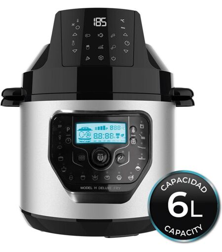 Robot de cuisine multifonctions qui cuisine pour vous tout type d'élaboration en un temps record. 27 manières différentes de cuisiner qui vous aideront à préparer des entrées, du riz, des pâtes, des ragoûts, des estouffades, des poissons, des desserts... et toutes les recettes que vous imaginez avec cet autocuiseur avec friteuse. L'ensemble de la friteuse à air chaud vous permettra de faire frire vos aliments d'une façon très saine. Il incorpore une balance pour peser avec une grande précision les aliments que vous introduisez dans la cuve afin de travailler avec des quantités exactes et d'obtenir des résultats excellents. Innovant couvercle Advance qui libère la pression plus facilement, en évitant les éclaboussures. Grâce à son couvercle rabattable, vous pourrez remuer et servir en évitant les taches. Il possède une cuve Excelsior extrêmement antiadhésive qui permet d'obtenir des résultats optimaux pour toutes vos recettes. Programmable 24 h pour que vous profitiez d'un repas chaud lorsque vous arrivez chez vous. Profitez des repas en famille grâce à sa grande capacité de 6 litres. Mode Eco pour économiser jusqu'à 50 % d'énergie pendant que vous cuisinez. Cuisinez avec de multiples options : Turbo, à pression, faire frire, à la vapeur, ragoût, feu lent, pocher, confire, fermenter, pain, dessert, riz, pâtes, plancha, faire revenir et four. Système intelligent GMCore qui adapte le temps d'élaboration en fonction de la quantité d'aliments. Inclus : un livre de recettes complet et un accès aux réseaux sociaux interactifs mais aussi à toutes les nouvelles recettes hebdomadaires de Cecotec. 11 températures ajustables jusqu'à 200 °C pour élaborer tout type de recettes. 5 pression ajustables jusqu'à 90 kPa pour cuisiner plus rapidement. Écran LCD avec panneau de contrôle très ergonomique qui permet une visualisation complète du processus de cuisson. Il possède les options de Chauffer et de Réchauffer pour s'adapter à tous les besoins de l'utilisateur. Contrôle guidé pas à pas par voix en 6 langues : espagnol, anglais, portugais, français, italien et allemand. Mémoire Eprom qui se souvient de la programmation en cas de coupure de courant. 14 systèmes de sécurité qui assurent le bon fonctionnement de l'autocuiseur avec des pressions élevées sans aucun danger. Composition Autocuiseur GM modèle H Deluxe Fry Cuve Daikin ovale antiadhésive Gobelet doseur Louche Plateau four Panier de friture Manuel Livre de recettes-Guide d'apprentissage ...