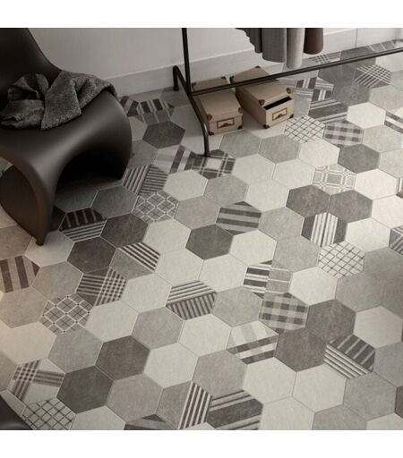 Avec son effet entre ciment et pierre, la gamme de carrelage grès cérame hexagone Hexatile et son rendu minéral se décline dans un camaïeu allant du blanc cassé à l'anthracite en passant par des nuances de gris. Le carreau hexagonal uni est complété de deux décors patchwork (Geo et Garden) existant chacun dans deux couleurs (Grey et Sand)) pour apporter une touche supplémentaire de déco. Utilisable au sol et mur, en pièce d'eau ou à vivre, son rendu très doux se mariera également très bien en jonction avec du parquet. Couleurs : White (blanc cassé) / Grey (gris / Black (anthracite) / Sand (crème) / Mink (beige) / Mud (marron) Format : hexagone 20x17,5cm / + 2 décors (Garden et Geo disponible chacun en Grey ou Sand uniquement) Épaisseur : 0,9cm Finition : Mat Effet : pierre Application : sol et mur / intérieur RECOMMANDATION : prévoir un volume de 10% ou 15% supplémentaire (pose droite ou diagonale) par rapport à votre surface pour les pertes liées aux coupes et au calepinage. ...