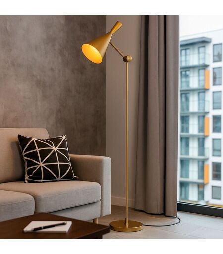 Le lampadaire "Olivia" présente un design contemporain avec une structure en aluminium disponible en nori, doré et blanc, rehaussée d'une finition mate. Ces lampes iconiques évoquent la simplicité sculpturale des marmites de cuivre et des traditionnels vases indiens, s'intégrant harmonieusement dans tous les intérieurs. Doté d'un abat-jour pivotant pour une orientation précise de la lumière, ce lampadaire offre une remarquable flexibilité fonctionnelle. Sa base solide, équilibrée et sécurisée, assure une stabilité optimale sans risque de basculement. La caractéristique distinctive de ce lampadaire contemporain réside dans son intérieur chaud et doré, reflétant une luminosité douce et chaleureuse. Équipé d'une douille pour ampoule E27 (non incluse) avec une puissance maximale de 40W, ce luminaire est accompagné d'un cordon de 187 cm intégrant une prise et un interrupteur européens standards, offrant ainsi une utilisation pratique et adaptable à divers agencements intérieurs. Notre ...