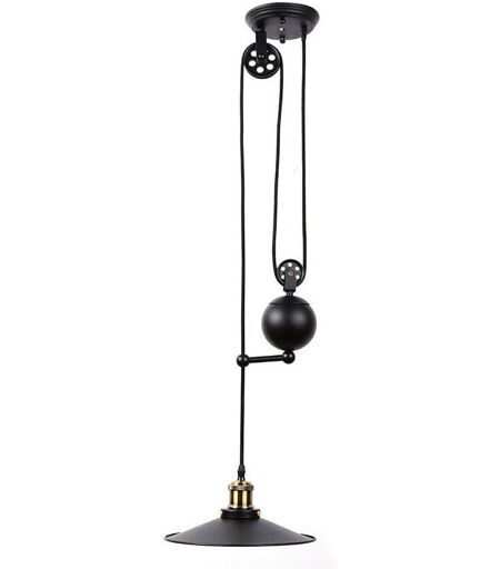 Lampe poulie industrielle en suspension. Lampe industrielle avec poulie appelée Clock Work, de design attractif et élégant, avec un air de rétro-antique mais à la fois très avant-gardiste, le vintage étant aujourd’hui très à la mode. Son système de poulie est t rès original et tendance. Elle est composée d’une base noir de type plafonnier qui doit être fixé au plafond et qui soutient le câble rétractile, très résistant et flexible pour pouvoir supporter les frottements et le poids de la lampe sans problème. Ce câble passe par une première poulie, qui soutient un corps en forme de boule de taille moyenne, possédant en son intérieur des poids qui permettent de régler la hauteur de la lampe. Le câble poursuit sa route vers la seconde poulie ancrée à la même base et retombe jusqu'à la douille et le diffuseur de la lampe. Nous ne pouvons pas oublier l'une des parties les plus importantes de cette belle lampe vintage : la petite pièce métallique qui sort de la boule et qui soutient la ...
