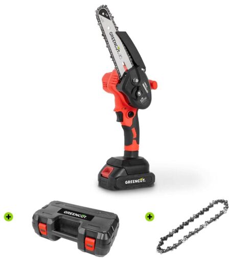Greencut - Mini tronçonneuse à main sans fil batterie 21V, lame 152,4mm, puissance 500W, verrouillage de sécurité, avec batterie, chargeur et 2