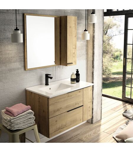 Cosyneo - Meuble de salle de bain 80cm vasque déportée - 2 tiroirs - miroir avec armoirette - roble (chêne clair) - king