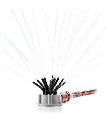 Cet asperseur pour jardin est doté de 12 tubes flexibles et orientables à 360° (avec 3 orifices chacun), ce qui permet de lancer ses 36 jets d?eau dans la direction souhaitée (2-10 m² environ). Il est livré avec un raccord de tuyau et un piquet pour l?enfoncer dans la pelouse. ...