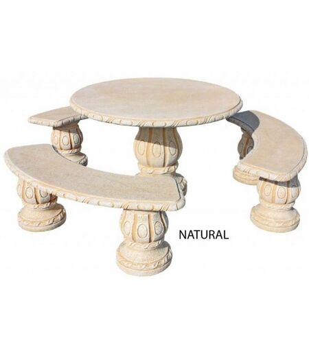 Description générale Ensemble repas de jardin rond AZALEA, composé d'une table et de trois bancs. Fabriqué en béton coloré, cet ensemble est conçu pour résister aux intempéries et offre une grande durabilité. Sa conception astucieuse permet un transport facile, car il est livré démonté et emballé sur une palette. Spécifications techniques Dimensions de la table : 120 x 74 cm Poids de la table : 175 kg Dimensions des bancs : 140 x 35 x 46 cm Poids des bancs : 113 kg chacun Matériau : Pierre reconstituée Couleur : Ocre Poids total de l'ensemble : 514 kg Compatibilité et accessoires Compatible avec divers styles de jardins et espaces extérieurs, cet ensemble peut être associé à des chaises supplémentaires ou des accessoires de décoration extérieure pour compléter votre aménagement. Installation L'ensemble est livré démonté pour faciliter le transport. L'installation nécessite un assemblage simple selon les instructions fournies, sans besoin d'outils spécialisés. Utilisation Idéal pour ...