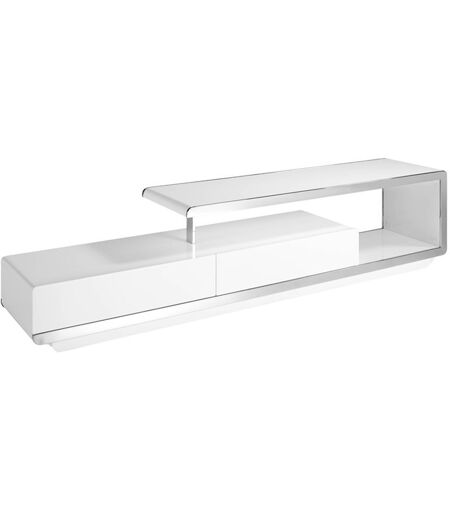 Meuble TV avec structure en MDF laqué en Blanc Brillant et détails en acier inox chromé avec structure des pieds sur structure en bois de pin peint en blanc. Unité à double tiroir. ...