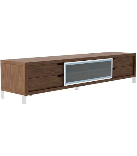 Meuble TV avec structure en bois plaqué noyer avec quatre tiroirs et porte coulissante en verre trempé sur guides longitudinaux. Pieds en acier inoxydable chromé. ...