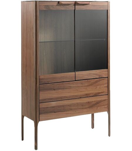 Vitrine avec structure en bois plaqué noyer et plan en fibre de verre marbré avec portes en verre trempé avec poignées en acier cuivré, deux tiroirs et étagères en verre trempé. Intérieur des tiroirs plaqué en mélaminé noyer avec éclairage intérieur intégré. ...