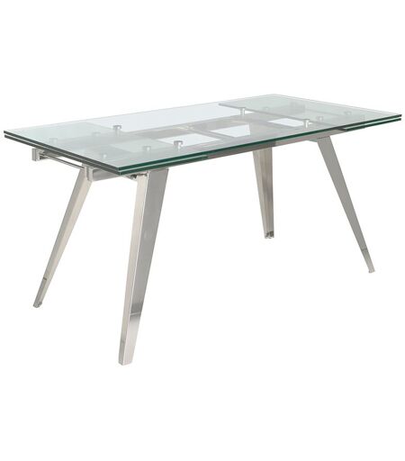 Table de salle à manger à rallonge avec plateau en verre trempé et pieds en acier inoxydable chromé. ...