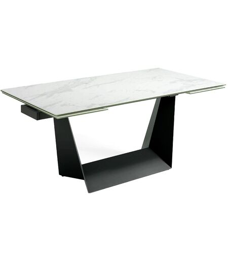 Table de salle à manger rectangulaire extensible avec plateau en porcelaine et pieds en acier massif peints en époxy noir. ...