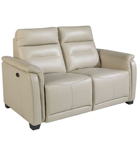 Canapé 2 places revêtu de cuir de vachette gris taupe avec mécanismes de relaxation électrique. Pieds en PVC effet wengé ...