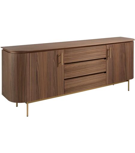Buffet avec structure en bois plaqué noyer avec trois tiroirs et deux portes avec étagères intérieures pour le rangement. Structure des pieds et des poignées en acier inoxydable doré. ...