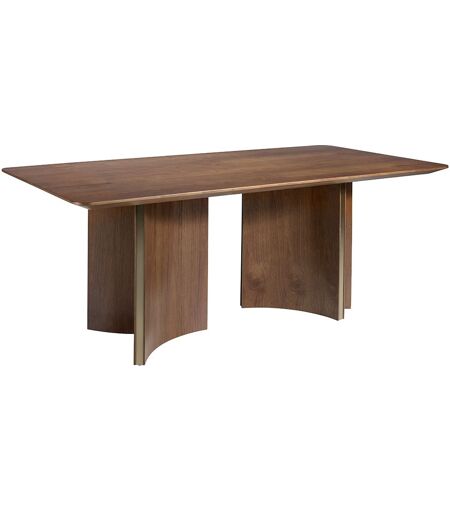 Table de salle à manger rectangulaire avec plateau fixe en bois plaqué noyer naturel. Piétement en bois plaqué noyer avec détails en acier doré. ...