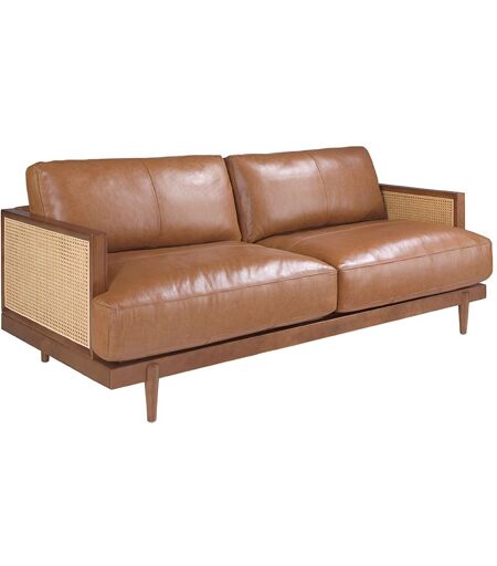 Canapé 3 places au design moderne, revêtu de cuir de vachette marron. Tant par son style que par ses pieds en bois couleur noyer, ce canapé apportera la touche d'avant-garde et d'élégance que vous recherchez dans votre intérieur. Un canapé tendance parfait pour votre coin salon avec un détail original en rotin. ...