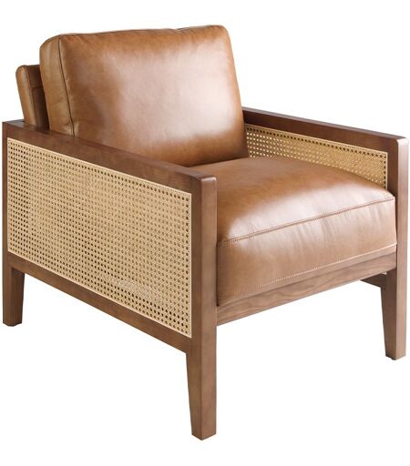 Fauteuil avec accoudoirs au design moderne avec assise et dossier garnis de cuir de vachette marron. Grâce à ses détails en rotin et à ses pieds en bois couleur noyer, ce fauteuil allie parfaitement design et confort. ...