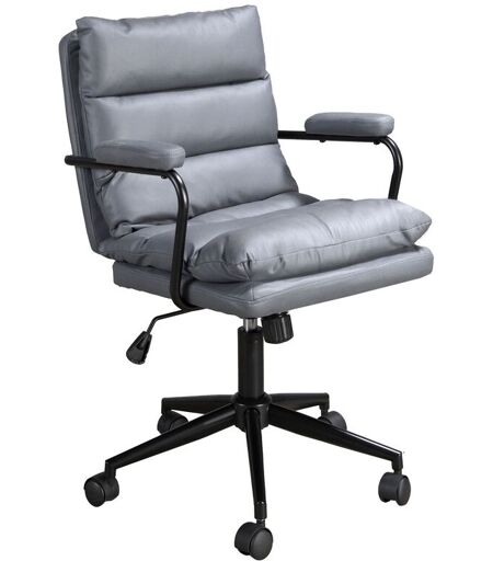 Chaise de bureau pivotant au design moderne dont l'assise et le dossier sont recouverts de tissu gris. Il est doté d'accoudoirs, ce qui le rend plus confortable. Grâce à ses pieds en acier inoxydable noir et à son assise réglable en hauteur, elle deviendra un élément indispensable de votre espace de travail, sans pour autant négliger le style le plus avant-gardiste. Ses roulettes apporteront la praticité supplémentaire dont vous avez besoin pour vos heures de travail ou d'étude. ...