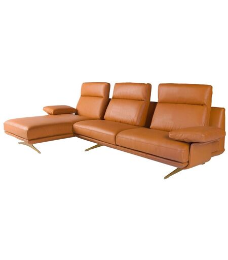 Canapé d'angle gauche 5 places au design moderne, revêtu de cuir de vachette marron terracotta. Ce canapé, tant par son style que par ses pieds en acier inoxydable de couleur dorée, apportera la touche d'avant-garde et d'élégance que vous recherchez dans votre intérieur. ...