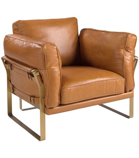 Fauteuil avec accoudoirs au design moderne avec assise et dossier garnis de cuir de vachette couleur camel. Ce fauteuil allie parfaitement design et confort, tant par son style que par ses pieds en acier inoxydable doré. ...
