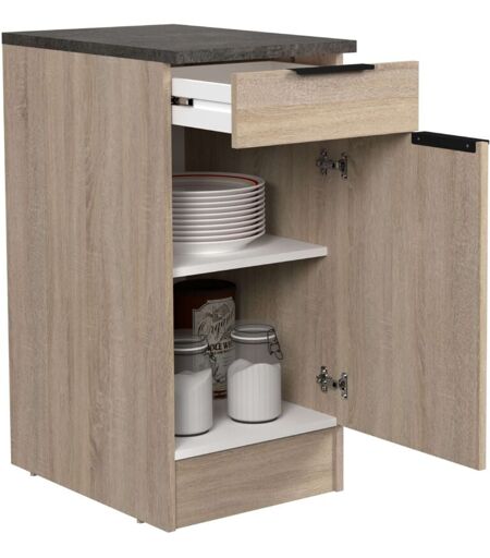 L'élément bas Arko se distingue dans la cuisine par sa finition robuste en chêne brut et ses détails noirs, créant un contraste visuel saisissant. Cette combinaison de tons terreux et foncés souligne non seulement la modernité de l'espace, mais apporte également une touche d'équilibre visuel et de modernité. Son design contemporain et sa poignée en aluminium laqué transforment chaque recoin de la cuisine en un espace attrayant, en phase avec les tendances actuelles. Fabriqué en mélamine, un matériau idéal pour les meubles grâce à sa résistance supérieure et à sa finition élégante. L'élément bas Arko comprend un tiroir supérieur avec glissières à billes pour un coulissement efficace, ainsi qu'une porte avec étagère intérieure pour un rangement supplémentaire. Mesurant 40 x 60 cm, il est parfait pour les cuisines compactes. Achetez-le dès aujourd'hui et optimisez votre espace cuisine. Dimensions : Largeur : 40 cm, Hauteur : 86 cm, Profondeur : 60 cm. Ce meuble est livré avec un kit de ...